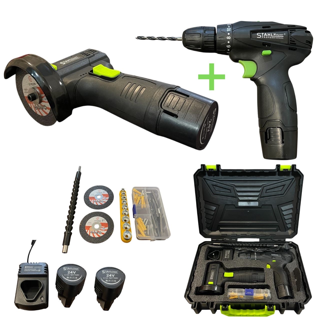 Професионален комплект STAHLMAYER 24V, включващ акумулаторен ударен винтоверт и мини безчетков ъглошлайф, събран в удобен куфар с две батерии и зарядно. Идеално решение за ремонт, монтаж, строителство и сервизни дейности – у дома или на терен.