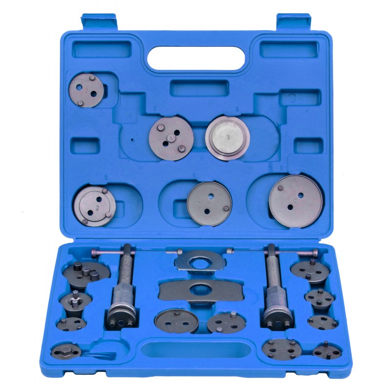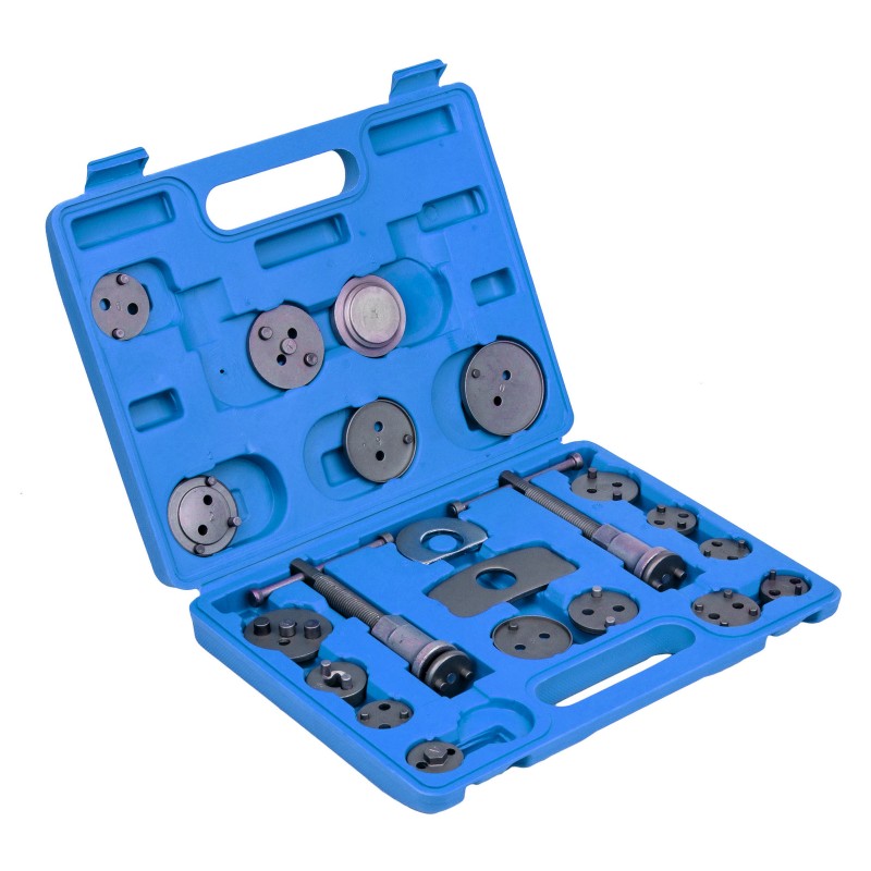 Професионален комплект за сваляне и обслужване на спирачни цилиндри HAWEK, предназначен за бърз и безопасен ремонт на широка гама леки автомобили. Комплектът съдържа 21 части и е подходящ както за ляво, така и за дясно въртене, което го прави универсално решение за предни и задни спирачни апарати.