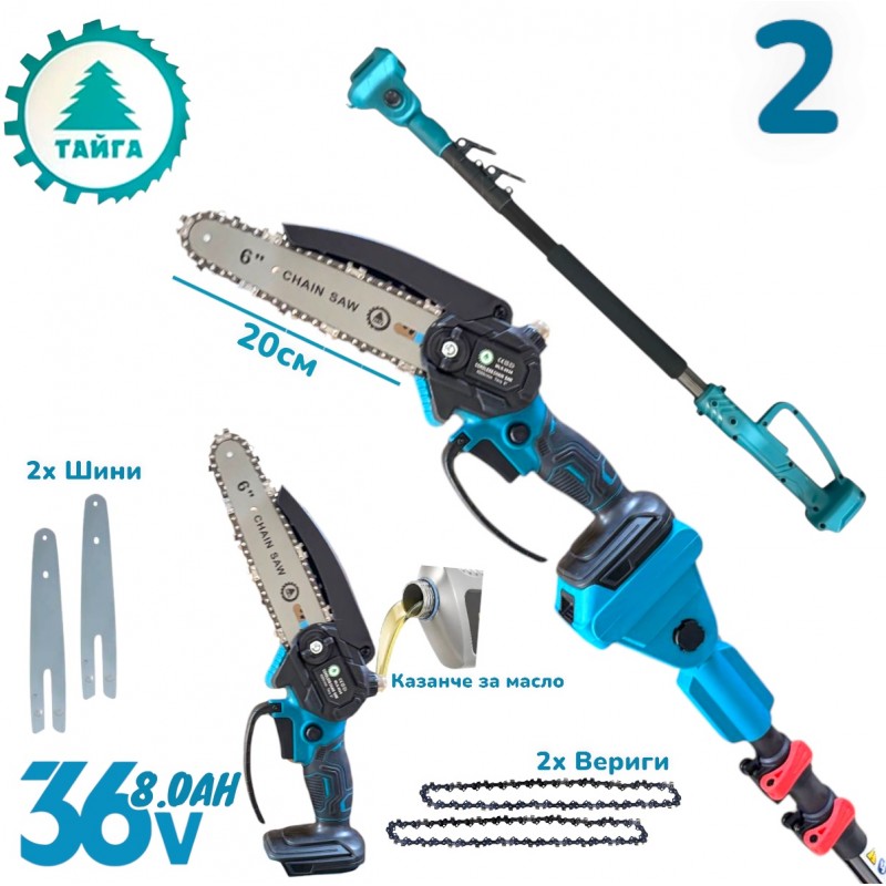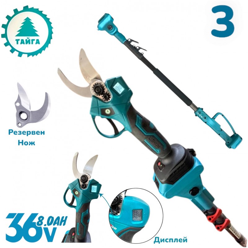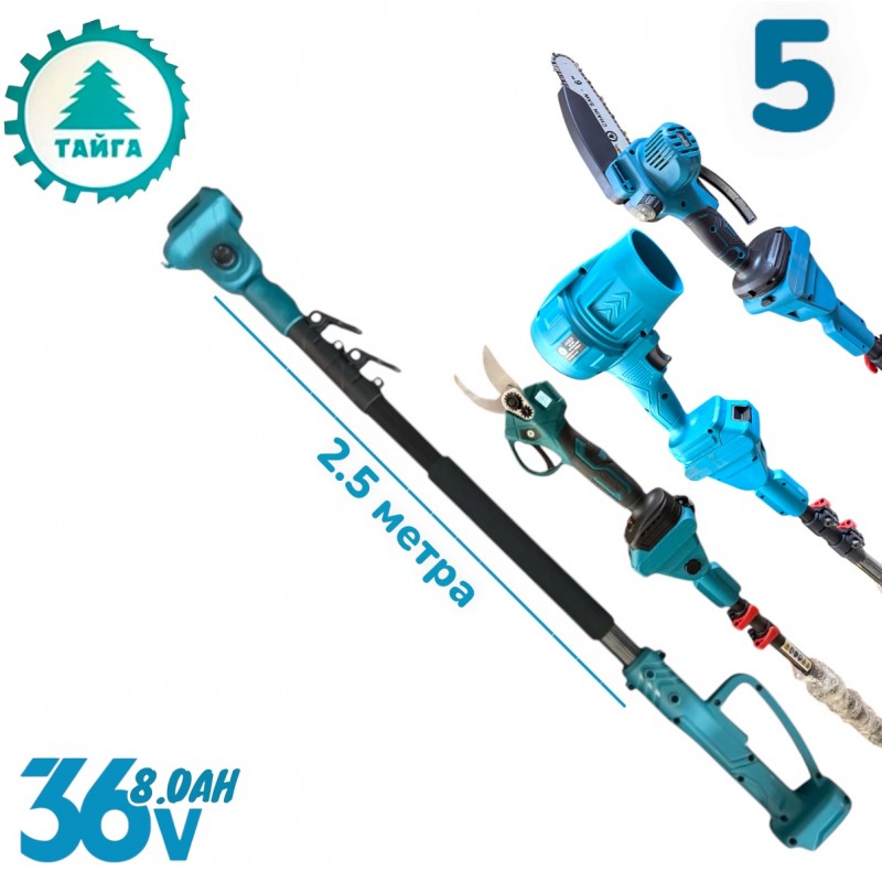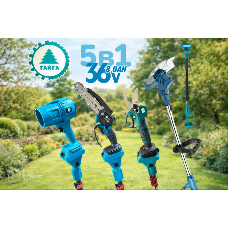 Комплект 5в1 Акумулаторни Градински Инструменти ТАЙГА 36V 8.0Ah – Резачка, Духалка, Лозарска Ножица, Тример и Телескопичен Прът