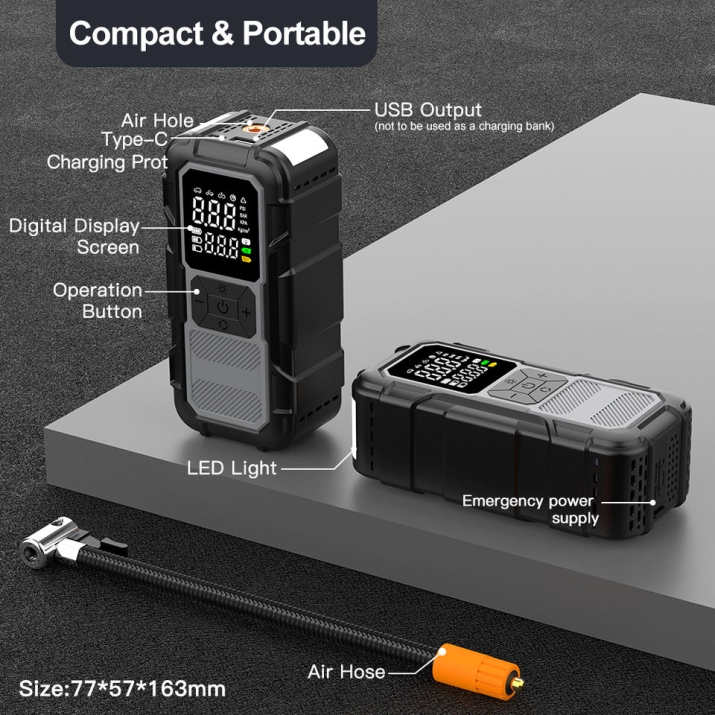 - Захранващ кабел на компресора към 12V контакт на автомобила: Използва се, когато вътрешната батерия е разредена, осигурявайки непрекъсната работа на компресора.