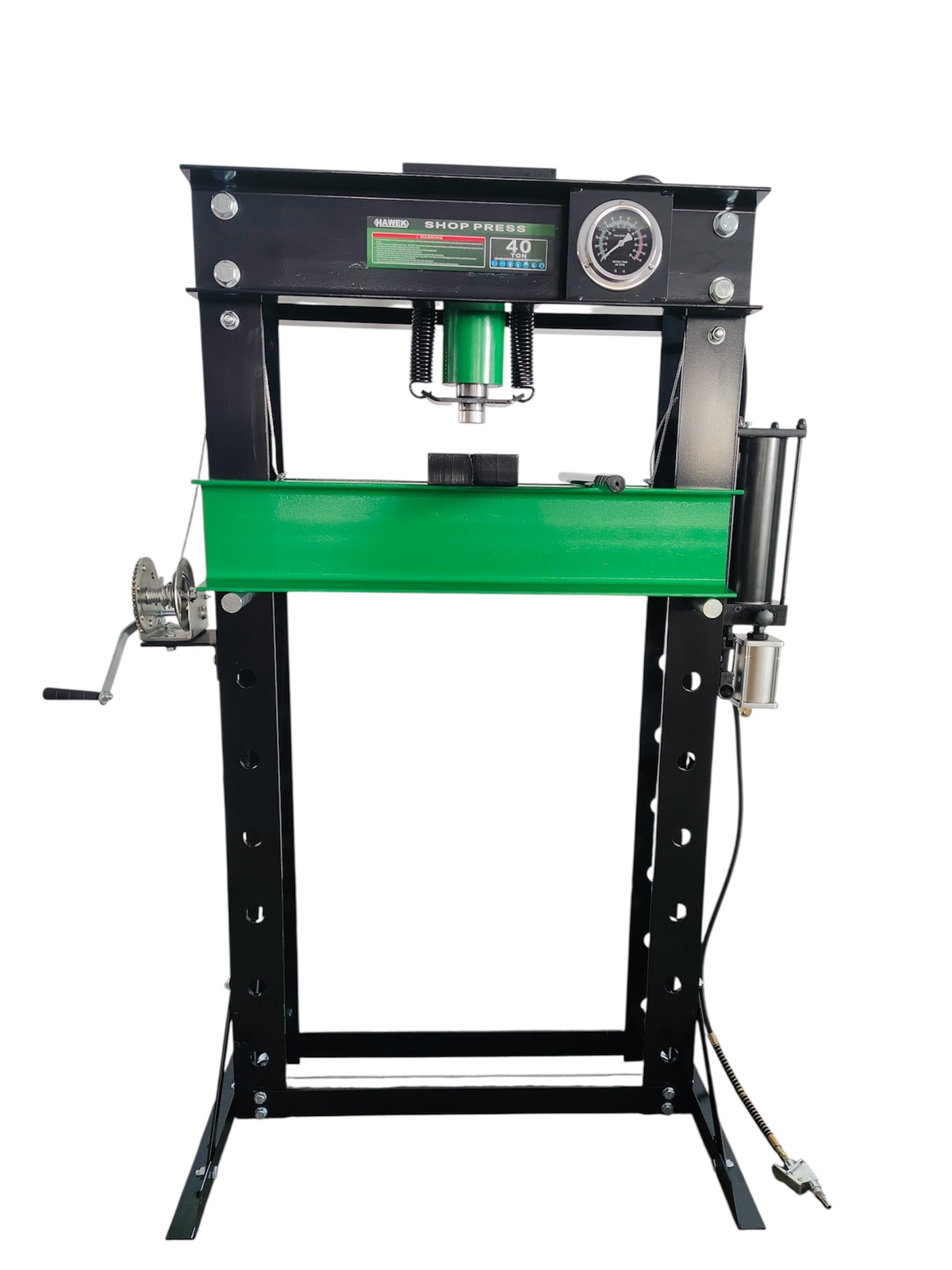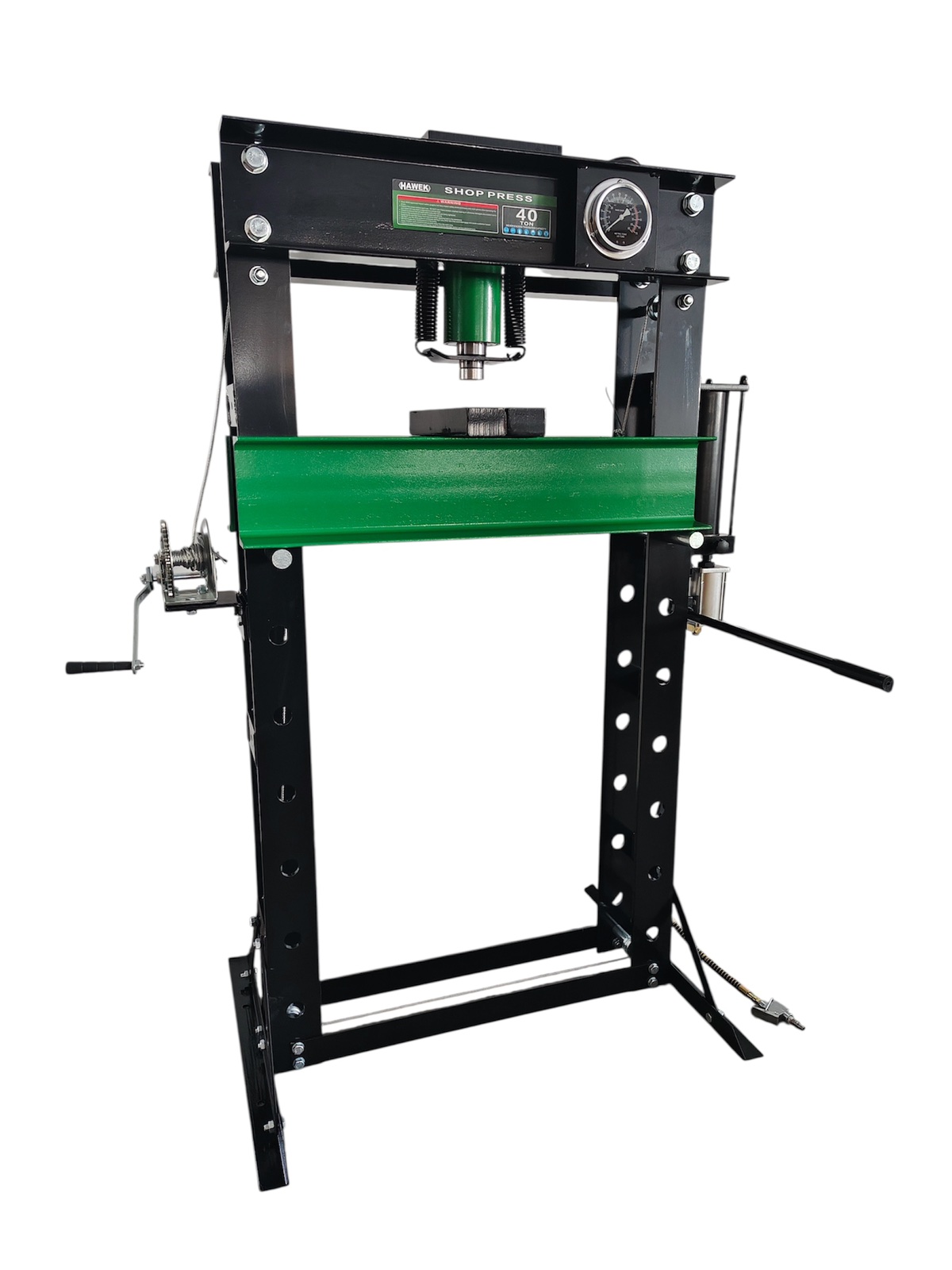Пневмо-хидравличната подова преса HAWEK 40 тона е високоефективно оборудване, предназначено за професионална работа при пресоване, огъване, монтаж и демонтаж на лагери, втулки и тежки метални детайли. Подходяща е за автосервизи, индустриални предприятия и професионални работилници.