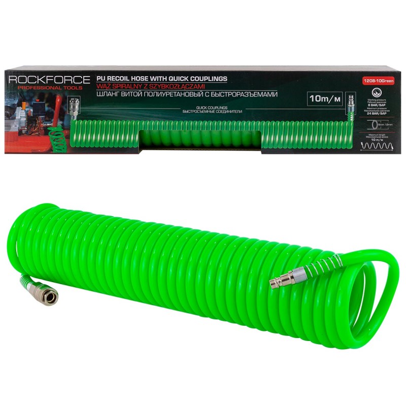 Полиуретанов спирален маркуч за въздух с бързи връзки 10 м / 8 х 12 мм ROCKFORCE