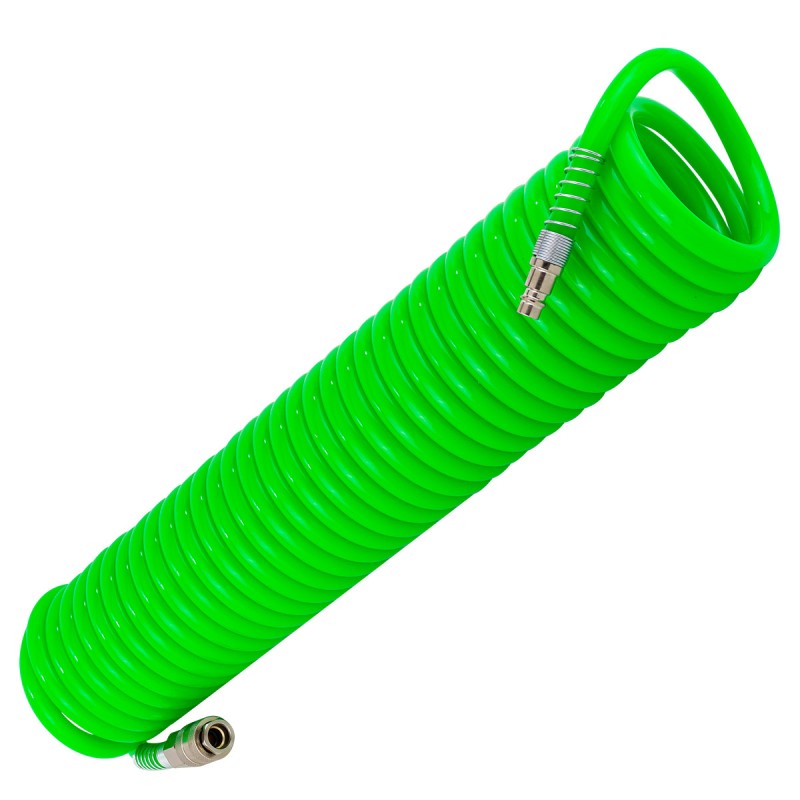 10 метра спирален, пневматичен маркуч. Необходим за работа с всеки компресор. Оборудван с бързи съединители, към него може да се свърже всяко пневматично устройство.